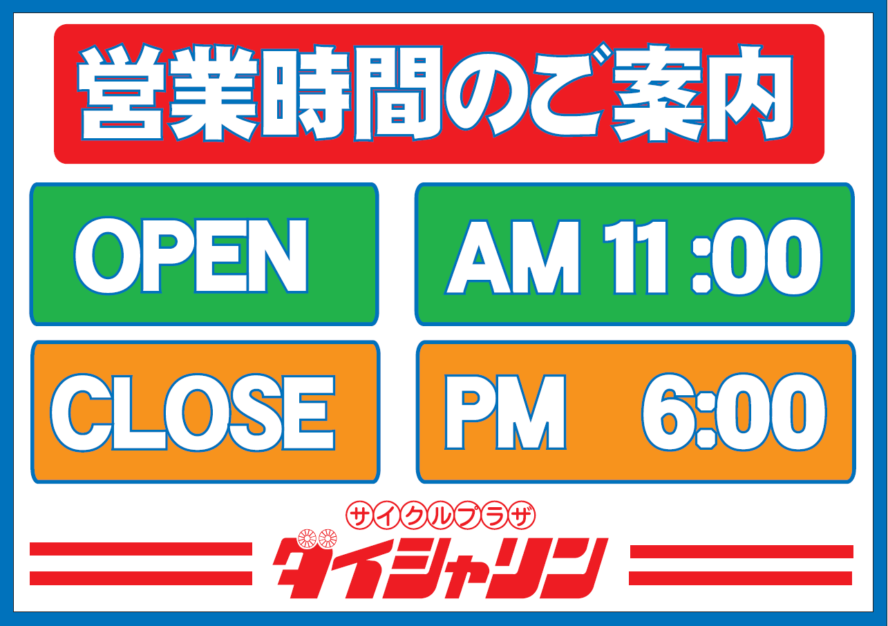 ダイシャリン古川店は、10/1~2月中旬頃まで下記内容の営業時間になります。お間違えの無いようお願いいたします。なお、お近くのダイシャリンの営業時間も異なる場合があります。お問い合わせの方をお願いいたします。大崎市の自転車店ダイシャリン古川店でした。