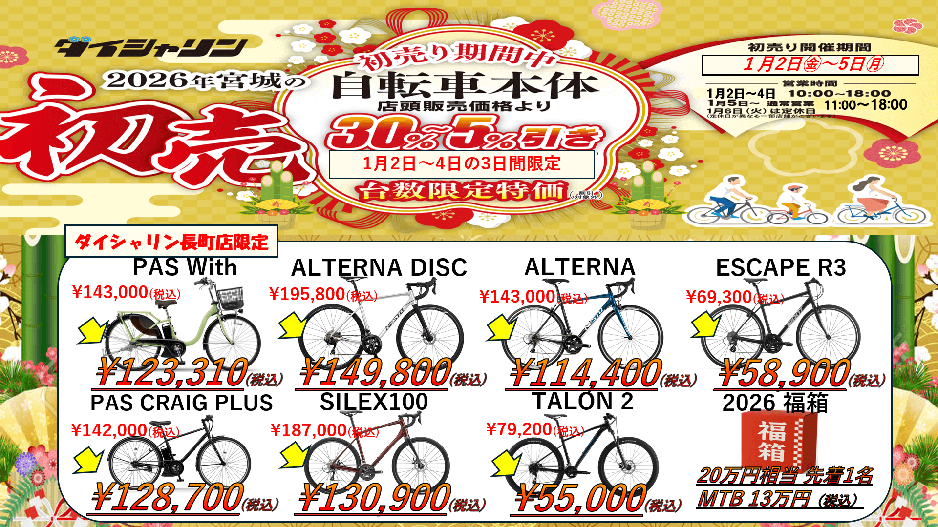 #ダイシャリン長町店#仙台市#太白区#長町#青葉区#自転車店#自転車#通学用自転車#通勤用自転車#子供車#ロードバイク#クロスバイク#マウンテンバイク#ファットバイク#電動自転車#初売り#セール