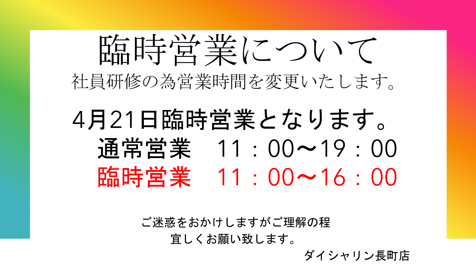 ダイシャリン長町店、4月21日(火)上記の時間での営業になりますのでお間違いのないようお願い致します。