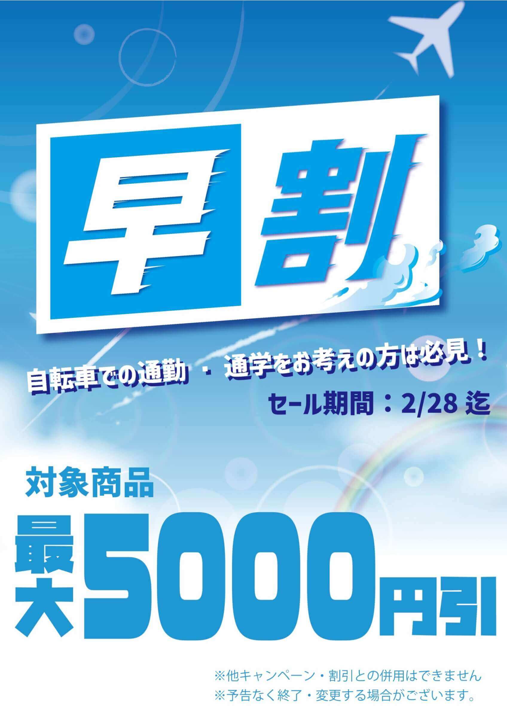 2月いっぱいまで早割セールとして最大5000円OFF自転車を多数ご用意。春にむけて自転車の購入をご検討中のお客様にとってお得な【早割セール】を開催中です。