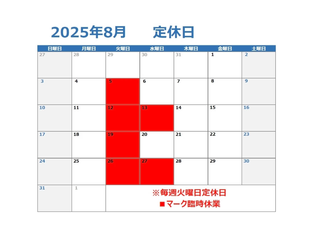 古川店 8月店休日