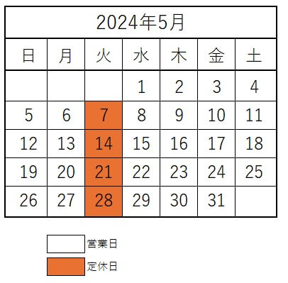 5月は毎週火曜日(7日、14日、21日、28日)が定休日です。営業時間は11:00~19:00となります。 ※3日(金)~6日(月)の各祝日は営業しております。