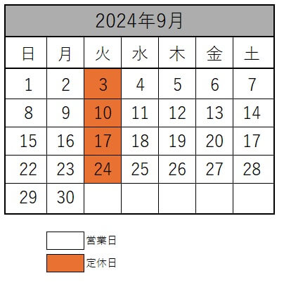 9月は毎週火曜日(3日、10日、17日、24日)が定休日です。
